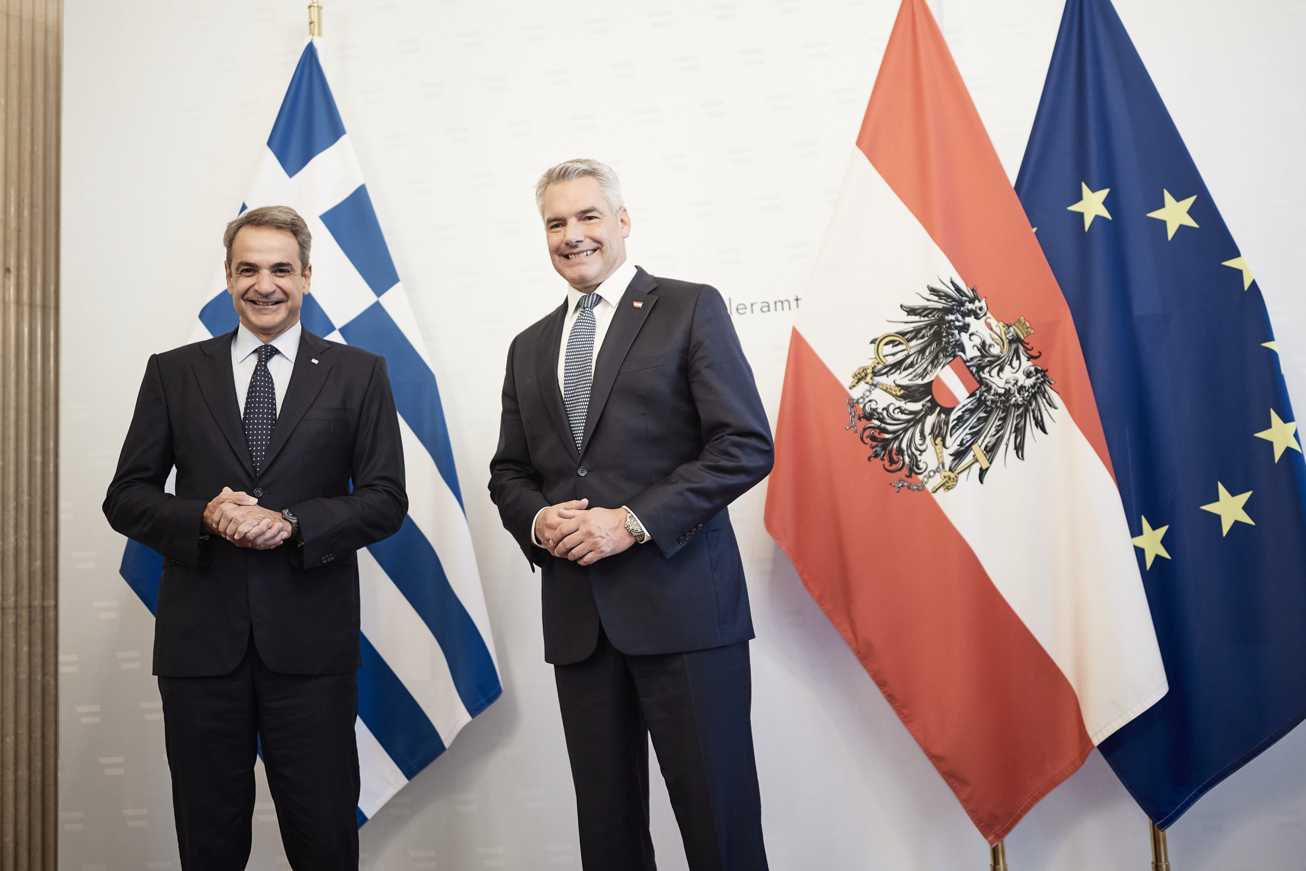 Ο πρωθυπουργός Κυριάκος Μητσοτάκης συναντήθηκε με τον Καγκελάριο της Αυστρίας Karl Nehammer. Πρόκειται για την πρώτη διμερή επίσκεψη του πρωθυπουργού σε ευρωπαϊκή πρωτεύουσα κατά τη νέα ευρωπαϊκή περίοδο και πριν από την πρώτη συνεδρίαση του Ευρωπαϊκού Συμβουλίου στις 17-18 Οκτωβρίου.