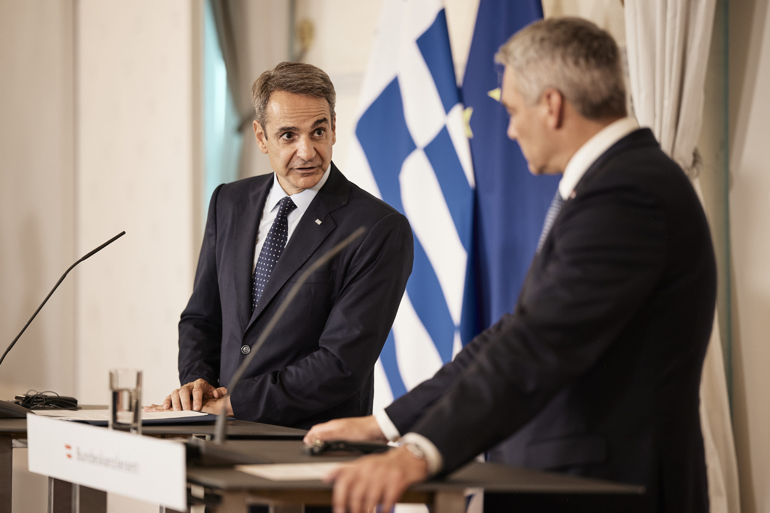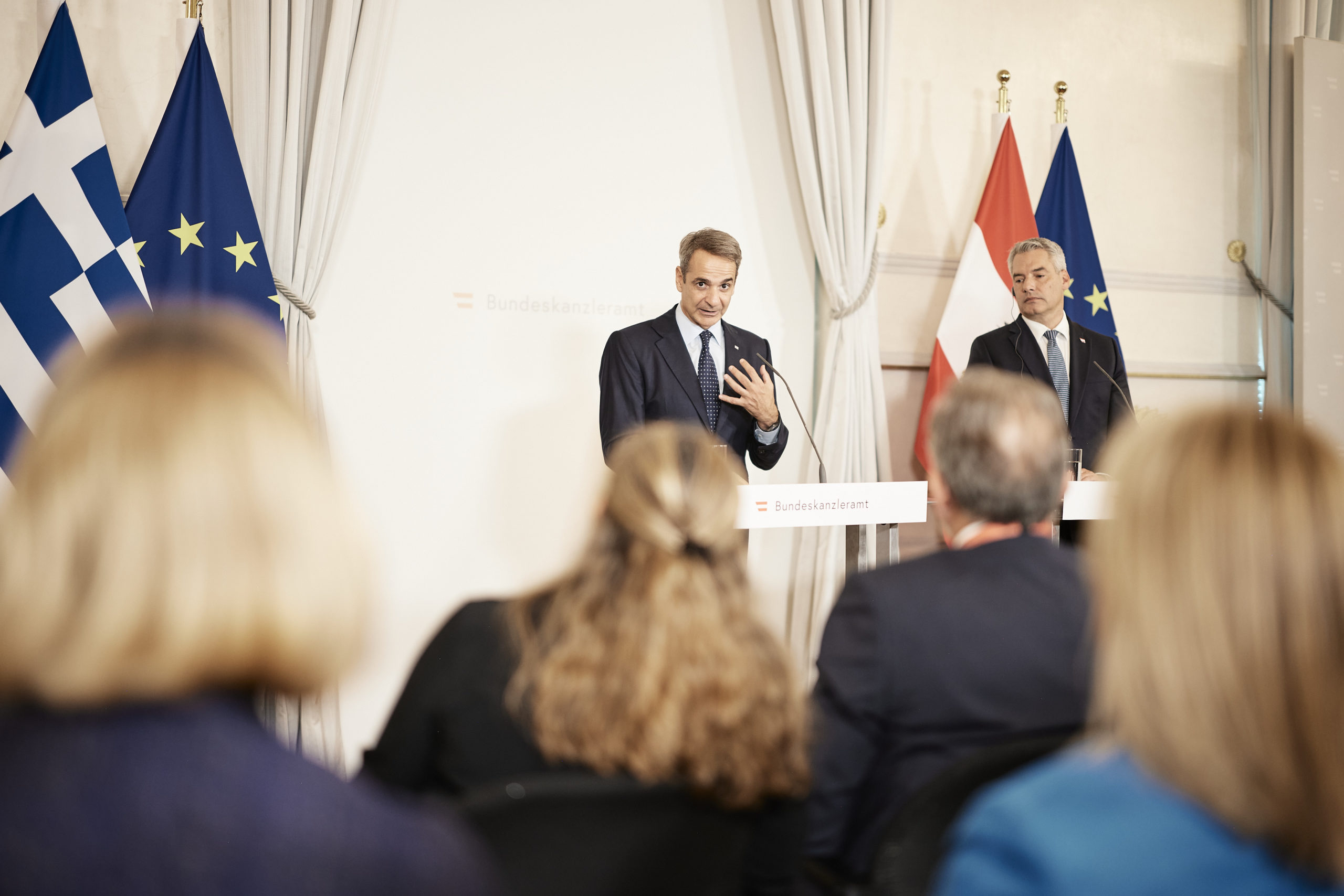 «Με πολύ μεγάλη χαρά ξαναβρίσκομαι στη Βιέννη, σε μια συνάντηση η οποία επιβεβαιώνει τις εξαιρετικές σχέσεις των δύο κρατών μας αλλά και τις πολύ στενές προσωπικές μας σχέσεις», είπε αρχικά ο κ. Μητσοτάκης.
