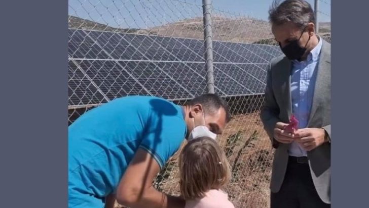 Ο Πρωθυπουργός Κυριάκος Μητσοτάκης βρέθηκε στα εγκαίνια της νέας φωτοβολταϊκής μονάδας της εταιρείας R Energy 1, συνολικής ισχύος 10 MW, στo Στεφάνι Κορινθίας. Εκεί τον υποδέχτηκε η μικρή Μυρτώ, η οποία του προσέφερε ένα λουλούδι.