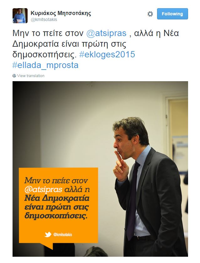 Με ένα χιουμοριστικό τρόπο σχολίασε ο Κυριάκος Μητσοτάκης τα ευρήματα των τελευταίων δημοσκοπήσεων, με ανάρτηση που έκανε στον προσωπικό του λογαριασμό στο Twitter. Συγκεκριμένα ο κ. Μητσοτάκης έγραψε: «Μην το πείτε στον Αλέξη Τσίπρα, αλλά η Νέα Δημοκρατία είναι πρώτη στις δημοσκοπήσεις», ενώ ανέβασε και μία ανάλογη αστεία φωτογραφία.