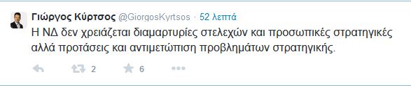 «Η ΝΔ δεν χρειάζεται διαμαρτυρίες στελεχών και προσωπικές στρατηγικές αλλά προτάσεις και αντιμετώπιση προβλημάτων στρατηγικής», έγραψε στον προσωπικό του λογαριασμό στο Twitter, ο ευρωβουλευτής της Νέας Δημοκρατίας, Γιώργος Κύρτσος.