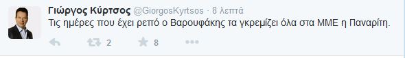 Τις δηλώσεις της συμβούλου του υπουργού Οικονομκών, Έλενας Παναρίτη, σχολίασε ο ευρωβουλευτής της Νέας Δημοκρατίας, Γιώργος Κύρτσος, μέσω του προσωπικού του λογαριασμού στο Twitter. Συγκεκριμένα, ο κ. Κύρτσος έγραψε: «Τις ημέρες που έχει ρεπό ο Βαρουφάκης τα γκρεμίζει όλα στα ΜΜΕ η Παναρίτη».