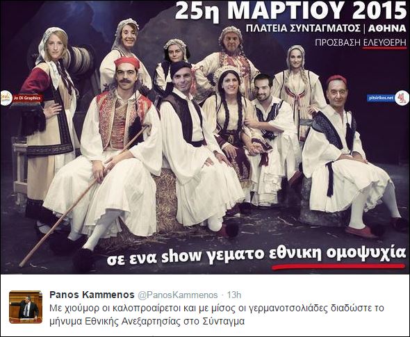 Με αρκετή δόση χιούμορ απάντησε ο Πάνος Καμμένος στις επικρίσεις που δέχεται για τις εκδηλώσεις που ετοιμάζει ενόψει της παρέλασης της 25ης Μαρτίου. Ο υπουργός Εθνικής Άμυνας ανέβασε στον προσωπικό του λογαριασμό στο Twitter μια φωτογραφία, που σαρώνει τις τελευταίες ώρες στο διαδίκτυο, και στην οποία ο ίδιος είναι ντυμένος βλαχοπούλα και ο Αλέξης Τσίπρας τσολιάς ενώ τα κυβερνητικά στελέχη παρουσιάζονται με παραδοσιακές ελληνικές φορεσιές.