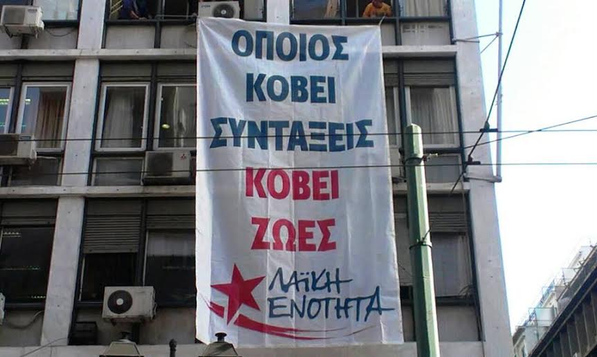 Μέλη της Λαϊκής Ενότητας, με επικεφαλής τον κ. Λαφαζάνη και τον κ. Στρατούλη πραγματοποιούν συμβολική κατάληψη στα κεντρικά γραφεία του ΙΚΑ στην Ομόνοια, διαμαρτυρόμενοι για τα νέα μέτρα στο ασφαλιστικό.