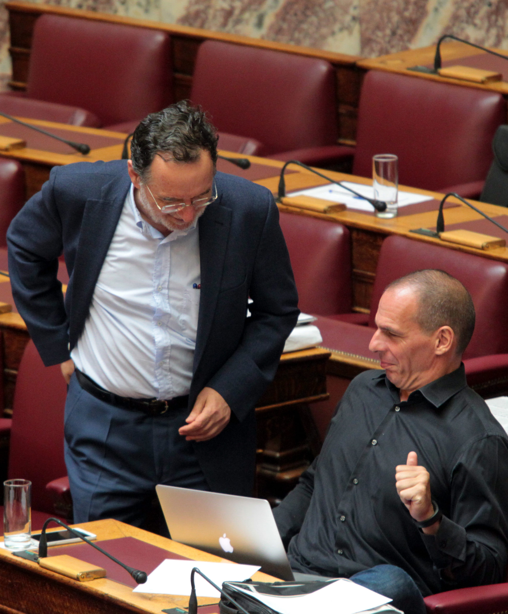 Ο πρώην υπουργός Παραγωγικής Ανασυγκρότησης, Παναγιώτης Λαφαζάνης συνομιλεί με τον πρώην υπουργό Οικονομικών, Γιάνη Βαρουφάκη.