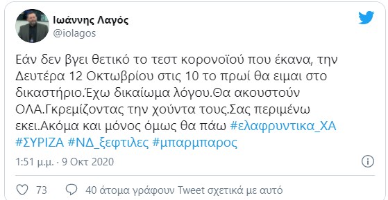 «Εάν δεν βγει θετικό το τεστ κορονοϊού που έκανα, την Δευτέρα 12 Οκτωβρίου στις 10 το πρωί θα είμαι στο δικαστήριο» έγραψε στο Twitter. «Έχω δικαίωμα λόγου. Θα ακουστούν ΟΛΑ. Γκρεμίζοντας την χούντα τους. Σας περιμένω εκεί. Ακόμα και μόνος όμως θα πάω» ανέφερε ακόμη ο Γιάννης Λαγός.