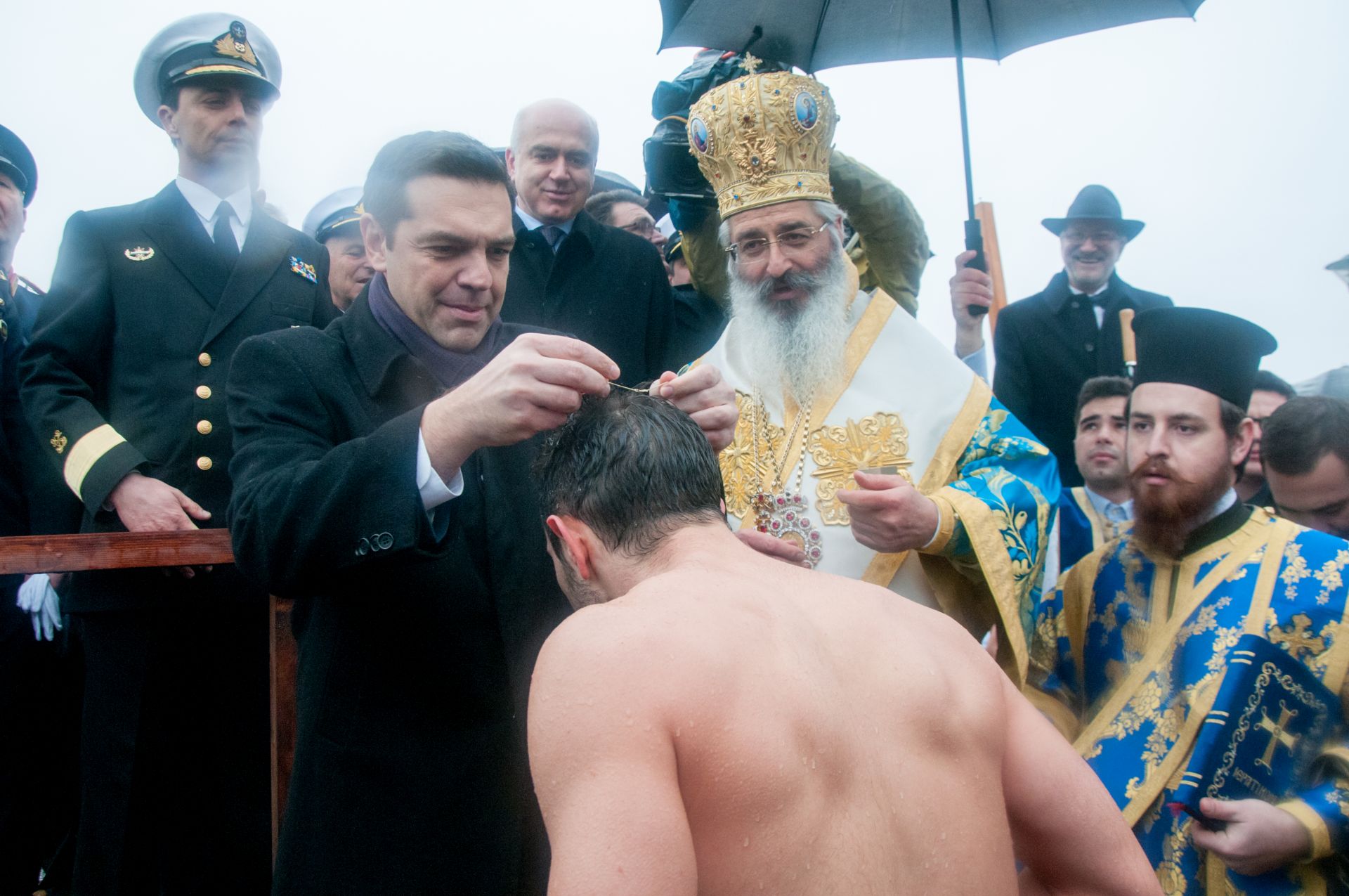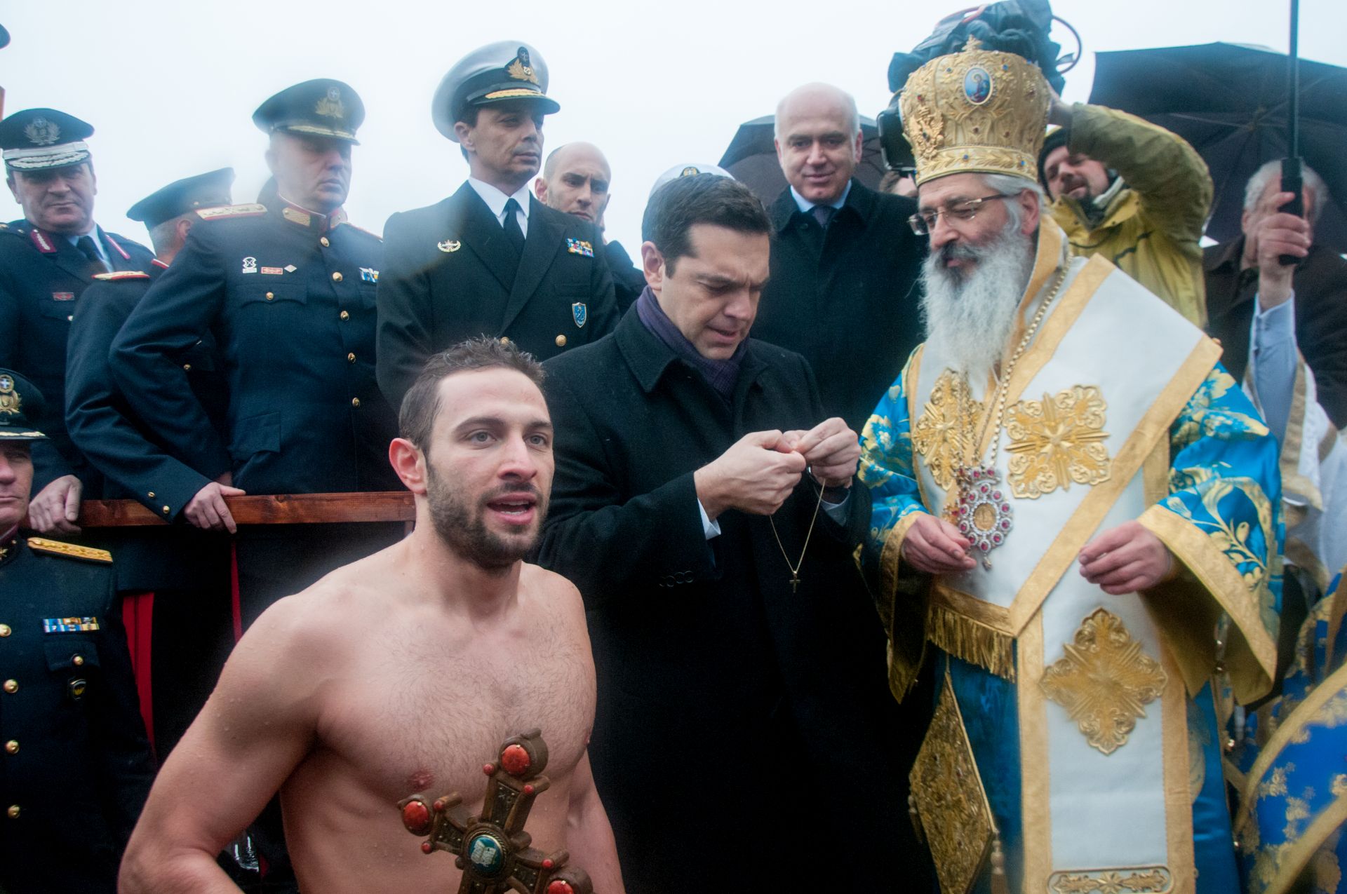 Ο κ. Τσίπρας φόρεσε και στον λαιμό του νέου που έπιασε τον Σταυρό, μια αλυσίδα με χρυσό σταυρό.