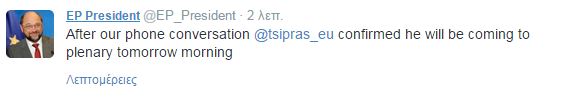 «Τώρα είναι στιγμή που πρέπει να γυρίσουμε στο τραπέζι των διαπραγματεύσεων για να βρεθεί λύση. Αυτή η λύση δεν θα βρεθεί σε μια μέρα. Σήμερα θα προσπαθήσουμε να μιλήσουμε και πάλι, να δείξουμε ανεκτικότητα και κατανόηση. Είναι η στιγμή να σταματήσουμε αυτά τα ξεσπάσματα και το λέω σήμερα στο ευρωπαϊκό κοινοβούλιο. Είναι απαράδεκτο για την Ε.Ε να θεωρείται τρομοκράτης από την ελληνική κυβέρνηση. Μακάρι όλοι να είχαν προσπαθήσει τόσο σκληρά όσο ο πρόεδρος της ευρωπαϊκής επιτροπής. Θα προσπαθήσουμε να κατεβάσουμε τις στεντόρειες φωνές και τους ρητορικούς τόνους. Να επιδείξουμε σεβασμό στην ψήφο του ελληνικού λαού. Μου λένε ότι δεν ήταν ένα όχι προς την Ευρώπη, ή ένα όχι προς το ευρώ. Άρα το μπαλάκι βρίσκεται στην ελληνική κυβέρνηση. Πρέπει να εξηγήσει σήμερα στις Βρυξέλλες πως μας βλέπει και πώς να απεμπλακούμε από αυτό το αδιέξοδο».