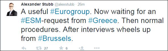 “Hταν ένα χρήσιμο Eurogroup. Τώρα περιμένουμε το αίτημα της Ελλάδας στον ESM. Στη συνέχεια θα ακολουθήσουν οι κανονικές διαδικασίες” έγραψε στο Twitter πριν από λίγο ο υπουργός Οικονομικών της Φινλανδίας Αλεξάντερ Στουμπ.