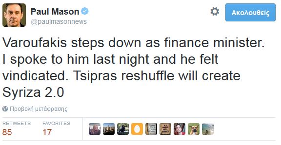 «Ο Βαρουφάκης παραιτείται από υπουργός Οικονομικών. Μίλησα μαζί του χθες το βράδυ και ο ίδιος αισθάνεται δικαιωμένος. Ο ανασχηματισμός του Τσίπρα θα δημιουργήσει το ΣΥΡΙΖΑ 2».