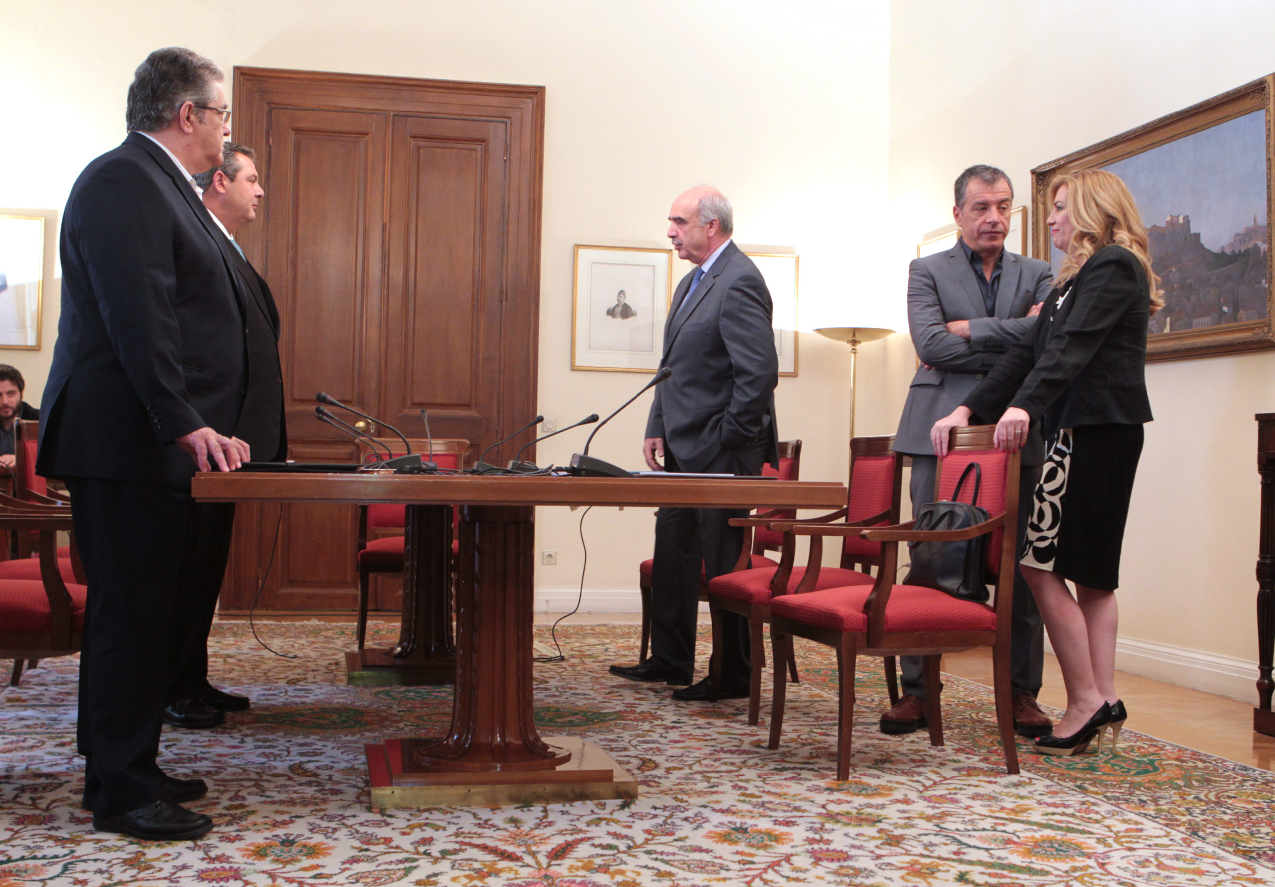 Λίγο νωρίτερα, είχαν προσέλθει, κατά σειρά, ο αρχηγός των ΑΝΕΛ και υπουργός Εθνικής Άμυνας Πάνος Καμμένος, η πρόεδρος του ΠΑΣΟΚ Φώφη Γεννημάτα, ο επικεφαλής του Ποταμιού Στ. Θεοδωράκης, ο προσωρινός πρόεδρος της ΝΔ Ευ. Μεϊμαράκης και ο γγ της ΚΕ του ΚΚΕ Δ. Κουτσούμπας.