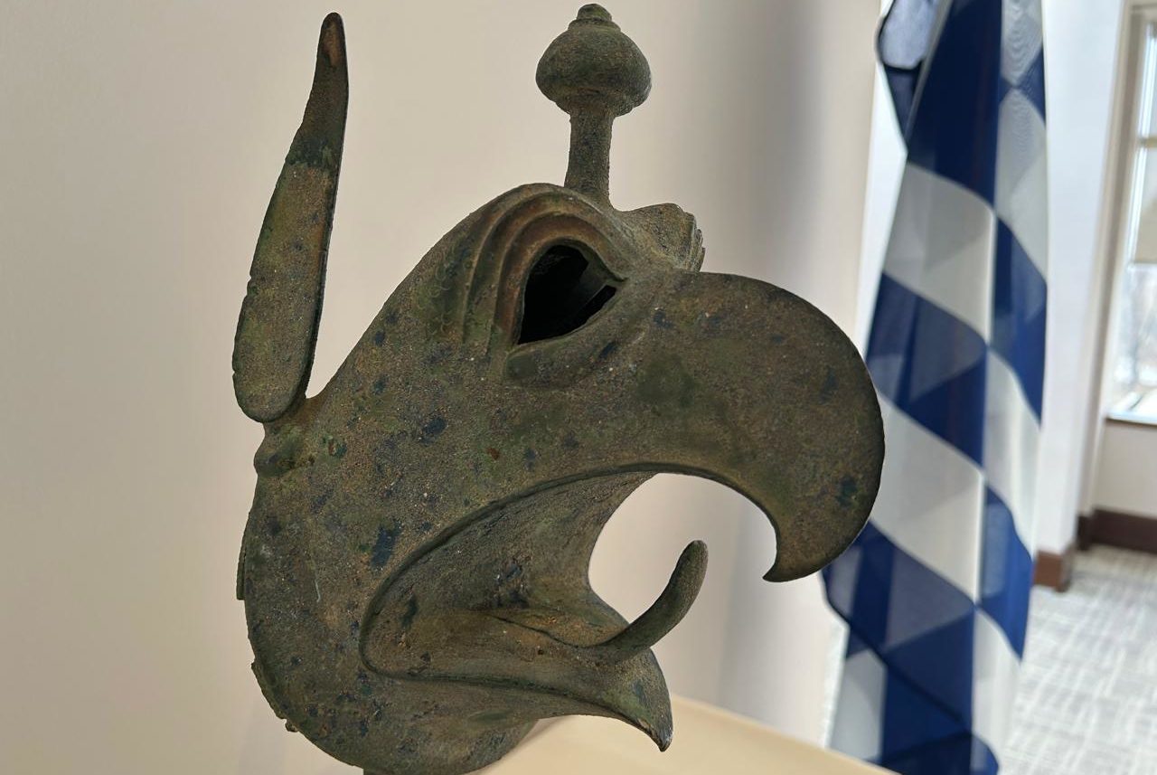 Όπως πληροφορεί ανακοίνωση του ΥΠΠΟ, η χάλκινη κεφαλή του γρύπα, η οποία κοσμούσε χάλκινο τριποδικό λέβητα και χρονολογείται στα 650-625 π.Χ., αποτελεί ένα εξαίρετο δείγμα της αρχαίας ελληνικής μεταλλοτεχνίας. Επιστρέφει στην Ελλάδα κατόπιν μακράς και συστηματικής συνεργασίας του υπουργείου Πολιτισμού και του μουσείου.