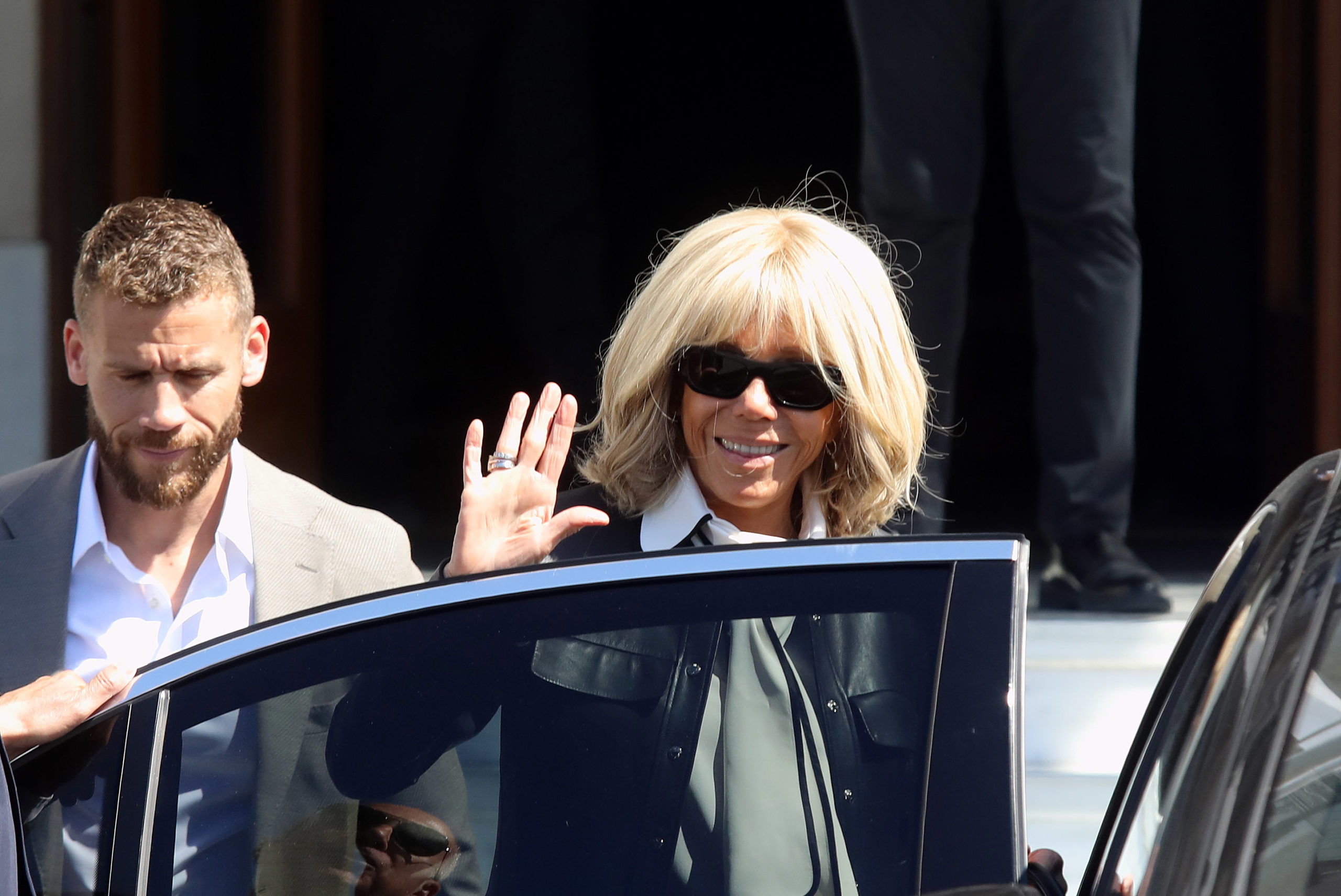 Η Μπριζίτ Μακρόν βγαίνει από το ξενοδοχείο «Μεγάλη Βρεταννία»