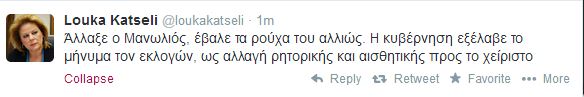 “Άλλαξε ο Μανωλιός, έβαλε τα ρούχα του αλλιώς. Η κυβέρνηση εξέλαβε το μήνυμα τον εκλογών, ως αλλαγή ρητορικής και αισθητικής προς το χείριστo” έγραψε η λούκα Κατσέλη στο λογαριασμό της στο Τwiiter σχολιάζοντας τον ανασχηματισμό.