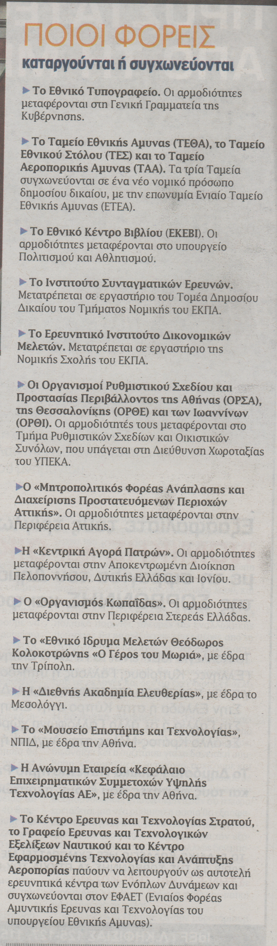 Στο προσχέδιο νόμου προβλέπεται η κατάργηση και συγχώνευση 20 φορέων του δημοσίου εκ των οποίων 7 Νομικά Πρόσωπα Ιδιωτικού Δικαίου.