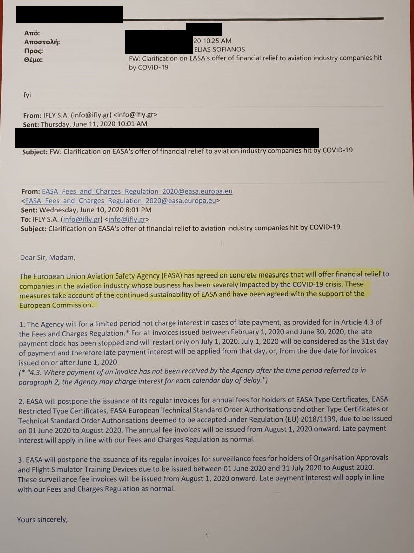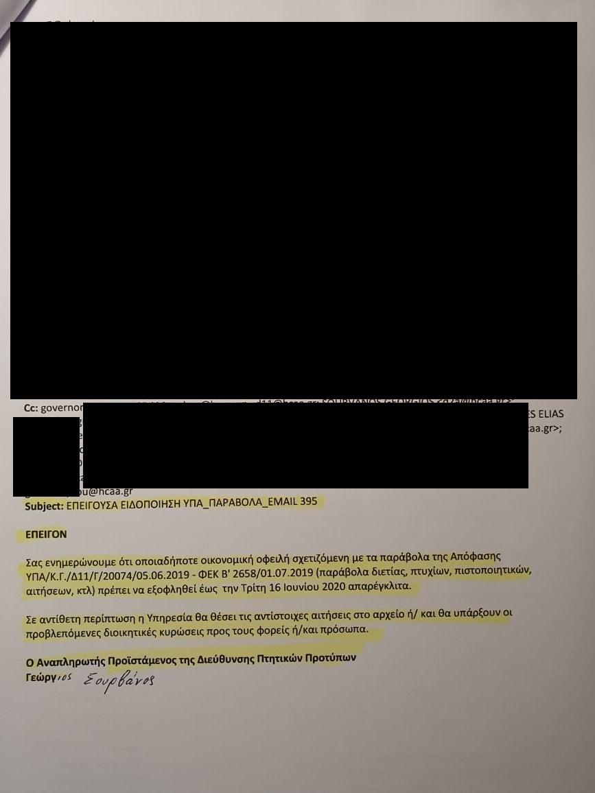 Μόνο που επειδή τα γραπτά μένουν, ο Αναπληρωτής Προϊστάμενος της Διεύθυνσης Πτητικών Προτύπων ζητά εξόφληση εδώ και τώρα. Και με το δίκιο του, διαφορετικά μπορεί να βρεθεί αντιμέτωπος με την κατηγορία της απιστίας. Το ερώτημα, όμως, που προκύπτει είναι αφού η διοίκηση της ΥΠΑ προτρέπει να μην πληρωθούν τα «παράνομα» ή «υπέρογκα» παράβολα, πώς θα διασφαλιστούν όλοι όσοι δραστηριοποιούνται ότι δεν θα βρεθούν κατηγορούμενοι ως κακοπληρωτές;