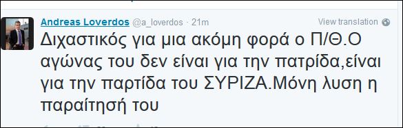 «Διχαστικός για μια ακόμη φορά ο Π/Θ.Ο αγώνας του δεν είναι για την πατρίδα, είναι για την παρτίδα του ΣΥΡΙΖΑ. Μόνη λύση η παραίτησή του», έγραψε ο Ανδρέας Λοβέρδος.
