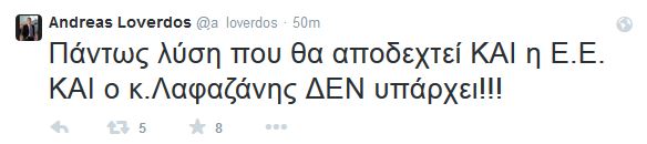 Τη διαπραγμάτευση της κυβέρνησης με τους Ευρωπαίους εταίρους, σχολίασε ο βουλευτής του ΠΑΣΟΚ, Ανδρέας Λοβέρδος, με ανάρτηση που έκανε στον προσωπικό του λογαριασμό στο Twitter, επισημαίνοντας ότι είναι δύσκολο να βρεθεί λύση με την οποία θα είναι ικανοποιημένη και η Ευρωπαϊκή Ένωση αλλά και η Αριστερή Πλατφόρμα, της οποίας ηγείται ο Παναγιώτης Λαφαζάνης. Συγκεκριμένα, έγραψε: «Πάντως λύση που θα αποδεχτεί και η Ε.Ε. και ο κ. Λαφαζάνης δεν υπάρχει».