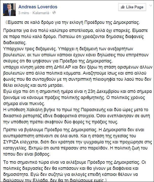 Το δικό του σχόλιο για τη δεύτερη ψηφοφορία για την εκλογή Προέδρου της Δημοκρατίας έγραψε στο facebook ο υπουργός Παιδείας, Ανδρέας Λοβέρδος, σημειώνοντας ότι «πρόκειται για ένα πολύ καλύτερο αποτέλεσμα» και ότι «είμαστε σε καλό δρόμο».