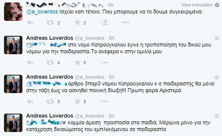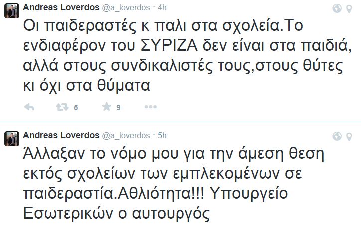 “Άλλαξαν τον νόμο μου για την άμεση θέση εκτός σχολείων των εμπλεκομένων σε παιδεραστία. Αθλιότητα! Υπουργείο Εσωτερικών ο αυτουργός” έγραψε στο λογαριασμό του στο twitter ο πρώην υπουργός του ΠΑΣΟΚ ενώ λίγο αργότερα πρόσθεσε: “Οι παιδεραστές και πάλι στα σχολεία. Το ενδιαφέρον του ΣΥΡΙΖΑ δεν είναι στα παιδιά αλλά στους συνδικαλιστές, στους θύτες κι όχι στα θύματα”.