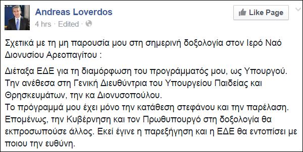 Τους λόγους για τους οποίους διέταξε ΕΔΕ για την απουσία του από την δοξολογία εξήγησε ο υπουργός Παιδείας, Ανδρέας Λοβέρδος, μέσω του λογαριασμού του στο facebook.