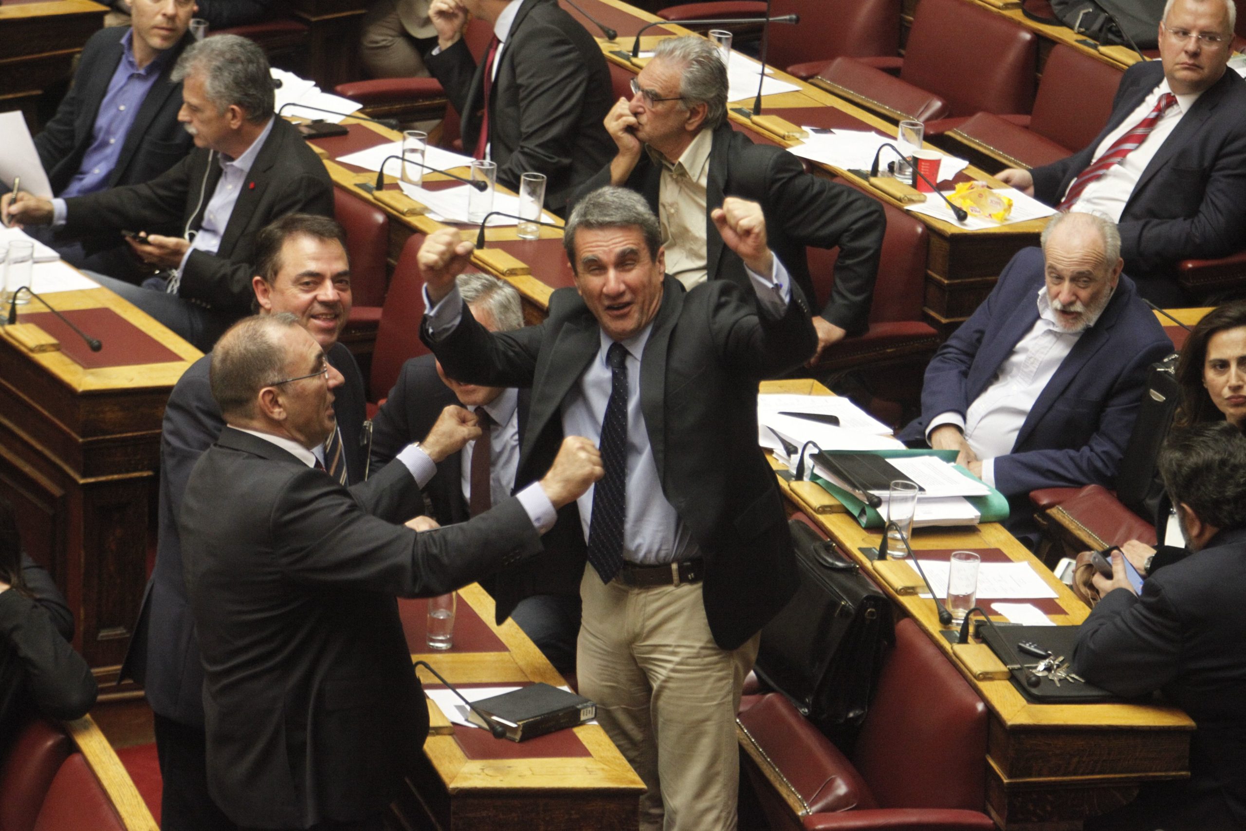 Την ώρα λοιπόν που βρισκόταν σε εξέλιξη η συζήτηση για το πολυνομοσχέδιο στη βουλή, ο βουλευτής της Δημοκρατικής Συμπαράταξης Ανδρέας Λοβέρδος και ο βουλευτής των ΑΝΕΛ Δημήτρης Καμμένος πανηγύρισαν έξαλλα για το εύστοχο τρίποντο του Βασίλη Σπανούλη, το οποίο έδωσε τη νίκη στους ερυθρόλευκους στο ΟΑΚΑ.