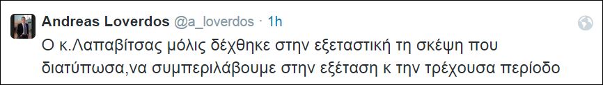 «Ο κ. Λαπαβίτσας μόλις δέχθηκε στην εξεταστική τη σκέψη που διατύπωσα, να συμπεριλάβουμε στην εξέταση κ την τρέχουσα περίοδο», έγραψε ο Ανδρέας Λοβέρδος.