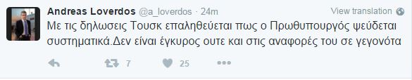 Επίθεση στον Πρωθυπουργό Αλέξη Τσίπρα, εξαπολύει ο κοινοβουλευτικός εκπρόσωπος της Δημοκρατικής Συμπαράταξης, Ανδρέας Λοβέρδος, με αφορμή τις δηλώσεις του προέδρου του Ευρωπαϊκού Συμβουλίου, Ντόναλντ Τουσκ.