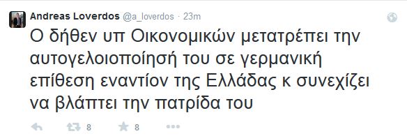 Σκληρή κριτική στον υπουργό Οικονομικών Γιάνη Βαρουφάκη, ασκεί ο βουλευτής του ΠΑΣΟΚ, Ανδρέας Λοβέρδος, με ανάρτηση που έκανε στον προσωπικό του λογαριασμό στο Twitter, επισημαίνοντας ότι με την στάση του βλάπτει την πατρίδα. Συγκεκριμένα, ο κ. Λοβέρδος, έγραψε: «Ο δήθεν υπουργός Οικονομικών μετατρέπει την αυτογελοιοποίηση του σε γερμανική επίθεση εναντίον της Ελλάδας και συνεχίζει να βλάπτει την πατρίδα του».