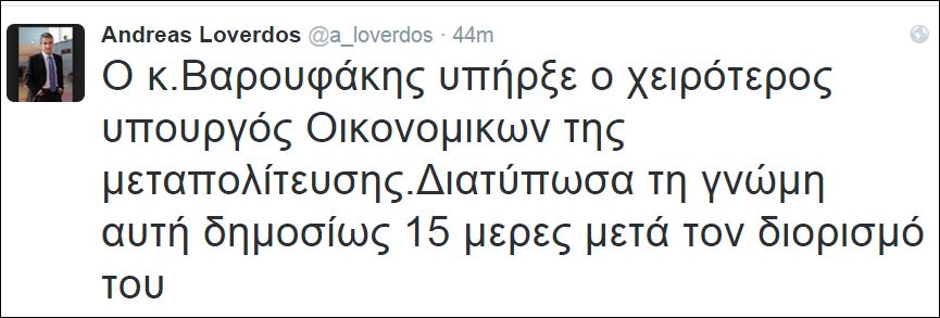 «O κ. Βαρουφάκης υπήρξε ο χειρότερος υπουργός Οικονομικών της μεταπολίτευσης. Διατύπωσα τη γνώμη αυτή δημοσίως 15 μέρες μετά τον διορισμό του», έγραψε ο κ. Λοβέρδος.