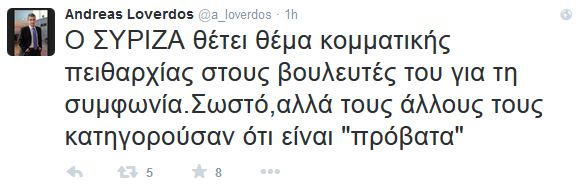 Το θέμα της κομματικής πειθαρχίας των βουλευτών του ΣΥΡΙΖΑ, σε ότι αφορά την συμφωνία με τους εταίρους, σχολιάζει ο βουλευτής του ΠΑΣΟΚ, Ανδρέας Λοβέρδος, με αναρτήσεις που έκανε στον προσωπικό του λογαριασμό στο Twitter. Συγκεκριμένα, ο κ. Λοβέρδος, έγραψε: «Ο ΣΥΡΙΖΑ θέτει θέμα κομματικής πειθαρχίας στους βουλευτές του για τη συμφωνία. Σωστό, αλλά τους άλλους τους κατηγορούσαν ότι είναι “πρόβατα”» .