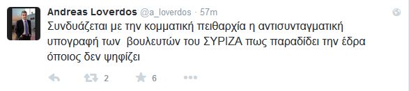 Με νέα του ανάρτηση λίγο αργότερα πρόσθεσε: «Συνδυάζεται με την κομματική πειθαρχία η αντισυνταγματική υπογραφή των βουλευτών του ΣΥΡΙΖΑ πως παραδίδει την έδρα όποιος δεν ψηφίζει».