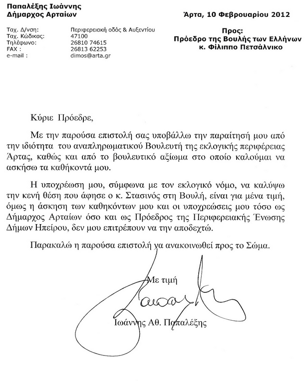 Ακόμη δεν έχει απαντήσει ο Χρήστος Γκόγκας, δεύτερος επιλαχών κατά σειρά επιτυχίας στις εθνικές εκλογές στην Άρτα, σχετικά με το αν θα αντικαταστήσει τον Παύλο Στασινό που παραιτήθηκε. Σύμφωνα με πληροφορίες, λόγω των εξελίξεων το τελευταίό 24ωρο, το σκέφτεται πολύ σοβαρά κι αυτός είναι ο λόγος που καθυστερεί να δώσει την τελική του απάντηση. Σε περίπτωση που αρνηθεί να καταλάβει την θέση του παραιτηθέντος βουλευτή, τελευταία επιλαχούσα είναι η Αναστασία Κατσαντούλα.Υπενθυμίζεται ότι ο πρώτος επιλαχών, δήμαρχος Αρταίων, Γιάννης Παπαλέξης, ξεκαθάρισε με επιστολή του ότι δεν προτίθεται να εγκαταλείψει τη θέση του Δημάρχου. Διαβάστε τι έγραψε στην επιστολή του.