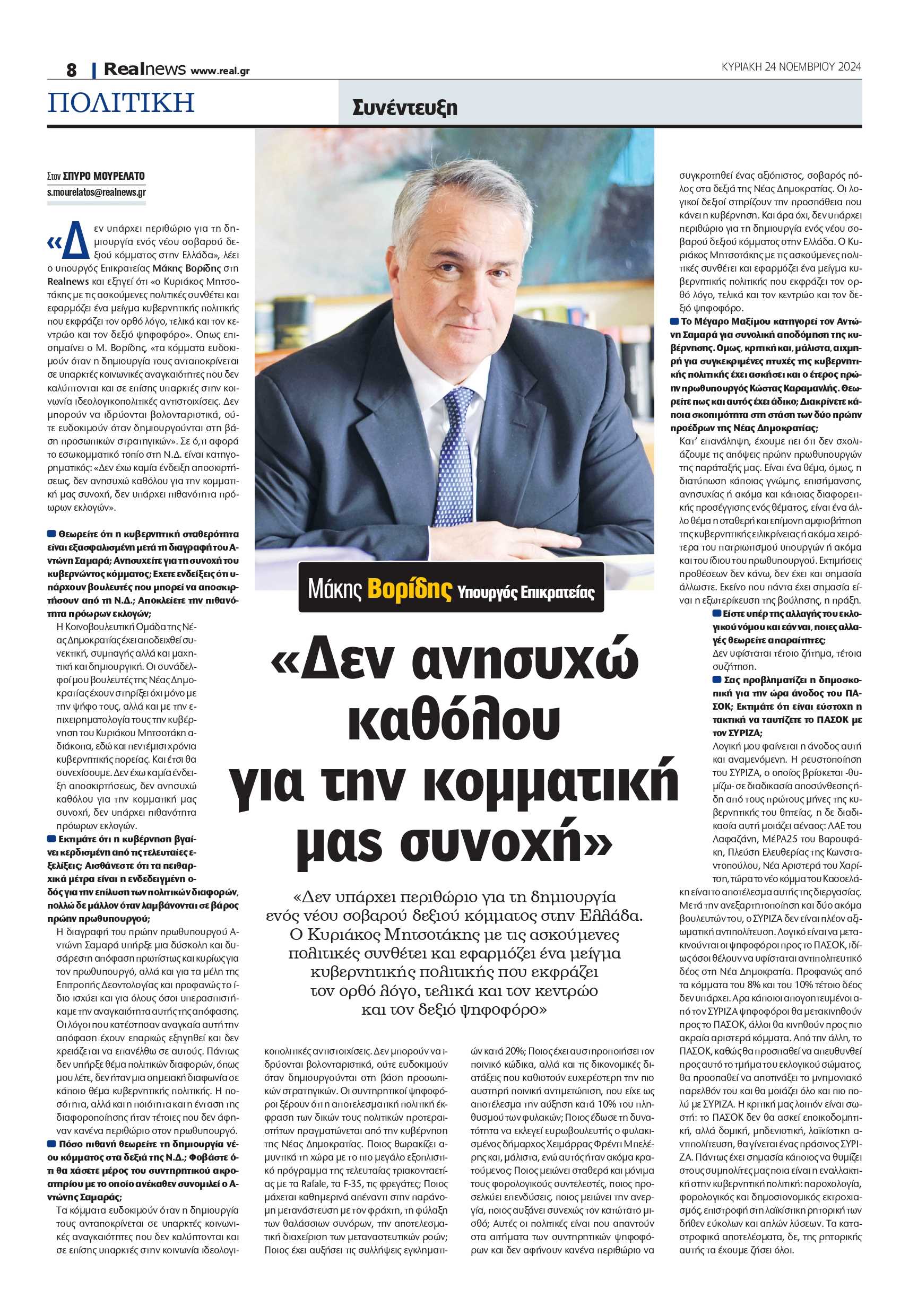 «Δεν υπάρχει περιθώριο για τη δημιουργία ενός νέου σοβαρού δεξιού κόμματος στην Ελλάδα», λέει ο υπουργός Επικρατείας Μάκης Βορίδης στη Realnews και εξηγεί ότι «ο Κυριάκος Μητσοτάκης με τις ασκούμενες πολιτικές συνθέτει και εφαρμόζει ένα μείγμα κυβερνητικής πολιτικής που εκφράζει τον ορθό λόγο, τελικά και τον κεντρώο και τον δεξιό ψηφοφόρο». Όπως επισημαίνει ο Μ. Βορίδης, «τα κόμματα ευδοκιμούν όταν η δημιουργία τους ανταποκρίνεται σε υπαρκτές κοινωνικές αναγκαιότητες που δεν καλύπτονται και σε επίσης υπαρκτές στην κοινωνία ιδεολογικοπολιτικές αντιστοιχίσεις. Δεν μπορούν να ιδρύονται βολονταριστικά, ούτε ευδοκιμούν όταν δημιουργούνται στη βάση προσωπικών στρατηγικών». Σε ό,τι αφορά το εσωκομματικό τοπίο στη Ν.Δ. είναι κατηγορηματικός: «Δεν έχω καμία ένδειξη αποσκιρτήσεως, δεν ανησυχώ καθόλου για την κομματική μας συνοχή, δεν υπάρχει πιθανότητα πρόωρων εκλογών».