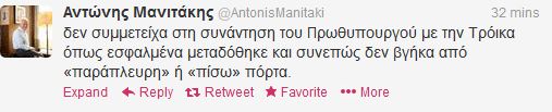 “Ο Υπουργός Διοικητικής Μεταρρύθμισης και Ηλεκτρονικής Διακυβέρνησης Αντώνης Μανιτάκης δεν συμμετείχε στη συνάντηση του Πρωθυπουργού με τους επικεφαλής της Τρόικας όπως εσφαλμένα μεταδόθηκε και κατά συνέπεια δεν βγήκε από «παράπλευρη» ή «πίσω» πόρτα”, αναφέρει η ανακοίνωση του υπουργείου.