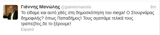 Αιχμηρός, όπως κάθε πρωί, ο Γιάννης Μανώλης, αναφέρθηκε με ανάρτησή του στο Twitter, στην τελευταία δημοσκόπηση…