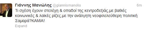 “Τι σχέση έχουν στελέχη & οπαδοί της κεντροδεξιάς,με βαθιές κοινωνικές & λαϊκές ρίζες,με την ανάλγητη νεοφιλελεύθερη πολιτική Σαμαρά?ΚΑΜΙΑ!”, έγραψε ο Γιάννης Μανώλης.