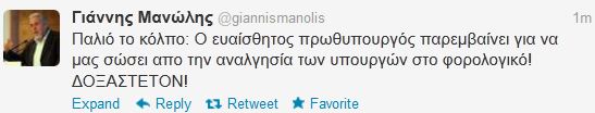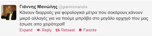 Μανώλης: Δοξάστε τον! Enikos Newsroom 11:16, Τρίτη 04 Δεκεμβρίου 2012 πολιτική Μανώλης: Δοξάστε τον! Ο Γιάννης Μανώλης σχολιάζει στο twitter τις …ήξεις αφίξεις στο φορολογικό. TWITTER ΑΝΤΩΝΗΣ ΣΑΜΑΡΑΣ ΓΙΑΝΝΗΣ ΜΑΝΩΛΗΣ ΦΟΡΟΛΟΓΙΚΟ Μοιράσου το: σχολίασε κι εσύ (0 σχόλια) Ακολουθήστε το enikos.gr στο Google News και μάθετε πρώτοι όλες τις ειδήσεις Δείτε όλες τις τελευταίες ειδήσεις από την Ελλάδα και τον Κόσμο στο enikos.gr Ειδήσεις Ροή Ειδήσεων 21 λεπτά πριν Χριστούγεννα στα μπλόκα οι αγρότες: Άνοιξαν στα διόδια και μοίρασαν προϊόντα στους πολίτες – Νέα σύσκεψη την Κυριακή στη Νίκαια 42 λεπτά πριν Κύκλωμα διακίνησης ναρκωτικών σε σχολεία: Τηλεφωνούσαν στους ανηλίκους την ώρα του μαθήματος – Οι διάλογοι-σοκ, τα «ψευδώνυμα» και τα βασανιστήρια 10 λεπτά πριν Αρχεία Επστάιν: Οι 500 σελίδες που λείπουν, τα αναπάντητα ερωτήματα και οι επώνυμοι – Τι έπεται 2 ώρες πριν Ζελένσκι: Μόνο οι ΗΠΑ και ο Τραμπ μπορούν να πιέσουν τη Ρωσία να βάλει τέλος στον πόλεμο 2 ώρες πριν Φοινικούντα: Προφυλακιστέος ο 30χρονος για συνέργεια στη διπλή δολοφονία – Και άλλα πρόσωπα στο «μικροσκόπιο» 2 ώρες πριν Αριθμολογία: Ο αριθμός του φύλακα αγγέλου σας, με βάση τον μήνα γέννησής σας – «Έτσι σας στέλνει σημάδια το σύμπαν» 3 ώρες πριν Πώς να απαλλαγείτε από τη μυρωδιά του τηγανητού φαγητού: Το μυστικό βρίσκεται στην κουζίνα σας 14 ώρες πριν Enerwave: Το νέο «ρεύμα» στη λιανική ενέργειας που αλλάζει την εμπειρία του καταναλωτή 1 ώρα πριν Ύπνος: Η διατροφή που μπορεί να σας βοηθήσει να κοιμάστε καλύτερα και να ζήσετε περισσότερο 7 λεπτά πριν Αποκαλύφθηκε το άγνωστο «GPS» της αρχαιότητας – Πώς οι ναοί «φώτιζαν» τον δρόμο των ναυτικών πριν από την εφεύρεση των φάρων 10 λεπτά πριν Αρχεία Επστάιν: Οι 500 σελίδες που λείπουν, τα αναπάντητα ερωτήματα και οι επώνυμοι – Τι έπεται 21 λεπτά πριν Χριστούγεννα στα μπλόκα οι αγρότες: Άνοιξαν στα διόδια και μοίρασαν προϊόντα στους πολίτες – Νέα σύσκεψη την Κυριακή στη Νίκαια 31 λεπτά πριν Ολυμπιακός – Κηφισιά 1-1: Δεύτερη σερί ισοπαλία για τους Ερυθρόλευκους – Υπό… αμφισβήτηση η κορυφή της Super League 42 λεπτά πριν Κύκλωμα διακίνησης ναρκωτικών σε σχολεία: Τηλεφωνούσαν στους ανηλίκους την ώρα του μαθήματος – Οι διάλογοι-σοκ, τα «ψευδώνυμα» και τα βασανιστήρια ENIKOS NETWORK Οι γυναίκες αποκαλύπτουν το πιο ελκυστικό πράγμα που μπορεί να κάνει ένας άνδρας Ομορφιά και αντιγήρανση: Ειδικοί μιλούν για συσκευές περιποίησης του δέρματος Ακύρωση ΑΦΜ για απάτες – Ποιους βάζει στο στόχαστρο η ΑΑΔΕ Ρεύμα: Πώς μπορείτε να αλλάξετε πάροχο γρήγορα και εύκολα – Τα βήματα της διαδικασίας Χαρτογραφώντας το «σημείο χωρίς επιστροφή»: Για πρώτη φορά αποκαλύπτεται με λεπτομέρεια το ακανθώδες όριο της ατμόσφαιρας τ... Η Google καταργεί τη λειτουργία «dark web report» – Πώς θα μπορούν οι χρήστες να διαγράφουν τα δεδομένα τους περισσότερα 19:28 , Σάββατο 20 Δεκεμβρίου 2025 Κυριάκος Μητσοτάκης: Στην Ιερουσαλήμ την Τρίτη ο Πρωθυπουργός για την τριμερή Ελλάδας, Κύπρου, Ισραήλ – Θα συναντηθεί και με τον Αμπάς Την στρατηγική σχέση Ελλάδας – Ισραήλ, και την ενίσχυση του τριμερούς άξονα συνεργασίας ... 16:39 , Σάββατο 20 Δεκεμβρίου 2025 Φάμελλος: «Η πρόταση για τις εκλογές έχει να κάνει με το συμφέρον της χώρας» Την πρόταση για προσφυγή στις εκλογές, ώστε να υπάρξει πολιτική αλλαγή, διατύπωσε ο πρόεδρος τ... 15:25 , Σάββατο 20 Δεκεμβρίου 2025 Μαρινάκης στον Realfm 97,8: Η κυβέρνηση σέβεται κάθε λογική διεκδίκηση των αγροτών, αλλά και το αίτημα των πολιτώ