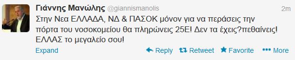 «Στην Νέα ΕΛΛΑΔΑ, ΝΔ & ΠΑΣΟΚ μόνον για να περάσεις την πόρτα του νοσοκομείου θα πληρώνεις 25Ε! Δεν τα έχεις;πεθαίνεις! ΕΛΛΑΣ το μεγαλείο σου!», έγραψε νωρίτερα στο Twitter ο πρώην βουλευτής, Γιάννης Μανώλης.