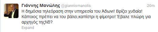 Γιάννης Μανώλης κατά Άδωνι Γεωργιάδη στο twitter, με αφορμή την παρουσία του βουλευτή της Νέας Δημοκρατίας σε εκπομπή της κρατικής τηλεόρασης…