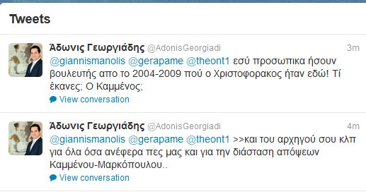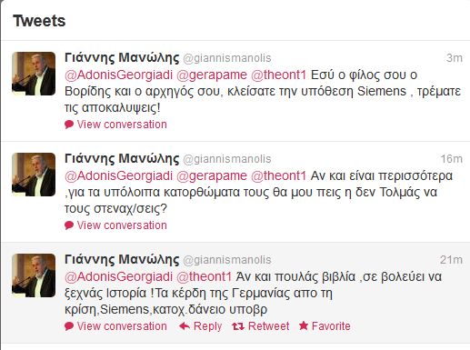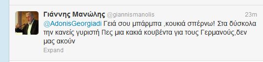 Για άλλη μία φορά ο  Άδωνις Γεωργιάδης και Γιάννης Μανώλης αντάλλαξαν “καρφιά” μέσω Twitter. Ο “καυγάς” ξεκίνησε από ένα σχόλιο του Μανώλη: