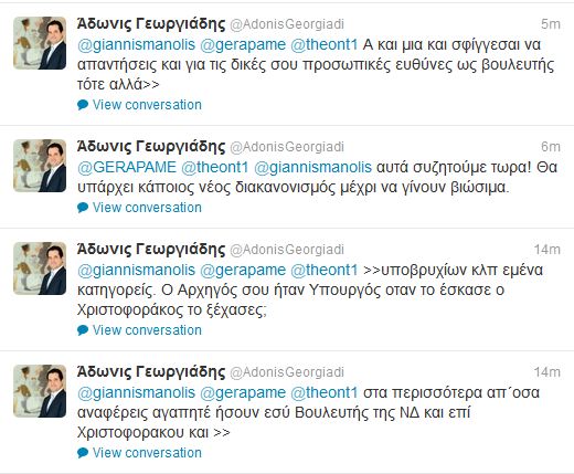 O Άδωνις Γεωργιάδης αντεπιτίθεται γράφοντας:”Στα περισσότερα απ΄ όσα αναφέρεις αγαπητέ ήσουν εσύ βουλευτής της Ν.Δ. και επί Χριστοφοράκου και υποβρηχίων κλπ. εμένα κατηγορείς. Ο αρχηγός σου ήταν υπουργός όταν το έσκασε ο Χριστοφοράκος, το ξέχασες;”