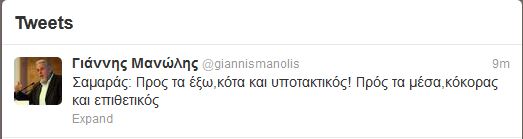 Πρωινό τιτίβισμα με… κακαρίσματα έκανε νωρίτερα ο Γιάννης Μανώλης.Το στέλεχος των Ανεξάρτητων Ελλήνων προχώρησε σε ένα επιθετικό σχόλιο κατά του Αντώνη Σαμαρά τον οποίο αποκάλεσε, ούτε λίγο ούτε πολύ, κότα!«Σαμαράς: Προς τα έξω, κότα και υποτακτικός! Πρός τα μέσα, κόκορας και επιθετικός», έγραψε στον προσωπικό του λογαριασμό στο Twitter ο πρώην βουλευτής της Νέας Δημοκρατίας.