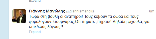 Ο βουλευτής των Ανεξάρτητων Ελλήνων Γιάννης Μανώλης έγραψε στον προσωπικό του λογαριασμό στο twitter: “τώρα στη βουλή οι ανάπηροι! Τους κόβουν τα δώρα και τους φορολογούν. Στουρνάρας: ότι πήρατε, πήρατε! Δηλαδή ψίχουλα, για επικ/κους λόγους!!”