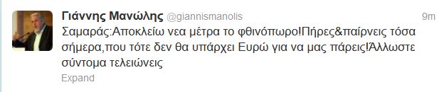 «Σαμαράς: Αποκλείω νέα μέτρα το φθινόπωρο! Πήρες &παίρνεις τόσα σήμερα, που τότε δεν θα υπάρχει Ευρώ για να μας πάρεις! Άλλωστε σύντομα τελειώνεις», έγραψε νωρίτερα στο Twitter ο πρώην βουλευτής Γιάννης Μανώλης.
