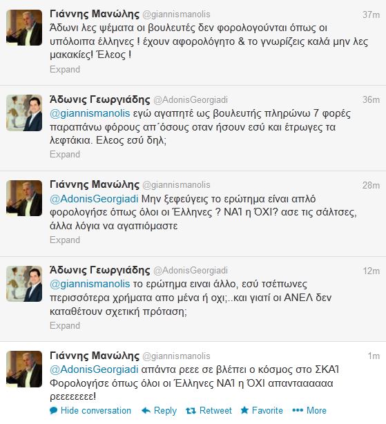 Πρωινά «πυρά» μέσω twitter ανταλλάσσουν ο Άδωνις Γεωργιάδης με τον Γιάννη Μανώλη, με αφορμή την ειδική φορολογική μεταχείριση των βουλευτών.
