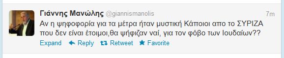 «Αν η ψηφοφορία για τα μέτρα ήταν μυστική Κάποιοι από το ΣΥΡΙΖΑ που δεν είναι έτοιμοι, θα ψήφιζαν ναί, για τον φόβο των Ιουδαίων??», αναφέρει χαρακτηριστικά το στέλεχος των Ανεξάρτητων Ελλήνων.