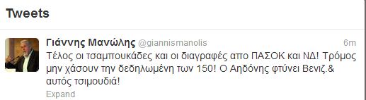 “Τέλος οι τσαμπουκάδες και οι διαγραφές απο ΠΑΣΟΚ και ΝΔ! Τρόμος μην χάσουν την δεδηλωμένη των 150! Ο Αηδόνης φτύνει Βενιζ.& αυτός τσιμουδιά!”, ήταν το σχόλιο του Γιάννη Μανώλη.