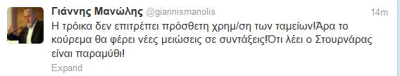 Για την απαγόρευση της πρόσθετης χρηματοδότησης των ταμείων και για το “παραμύθι”του Στουρνάρα γράφει στο λογαριασμό του στο twitter ο Γιάννης Μανώλης.