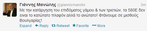 “Με την κατάργηση του επιδόματος γάμου φτάνουμε σε μισθούς Βουλγαρίας”, σχολιάζει στο twitter ο Γιάννης Μανώλης.
